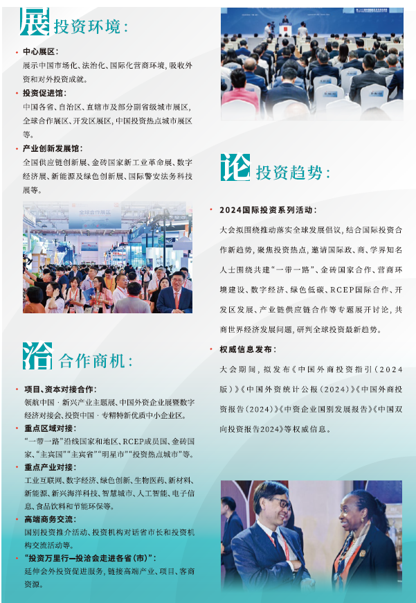 第二十四届投洽会将于2024年9月8日至11日在中国厦门举办,贯彻践行全球发展倡议,坚持高质量“引进来”和高水平“走出去”,围绕“扩大双向投资 共促全球发展”永久主题,突出多双边经贸交流,推动数字、绿色等领域产业投资合作,努力办成具有重要影响力的双向投资国际公共产品,促进世界各国扩大相互开放和共享投资机遇,为建设开放型世界经济、构建全球发展共同体贡献力量。
